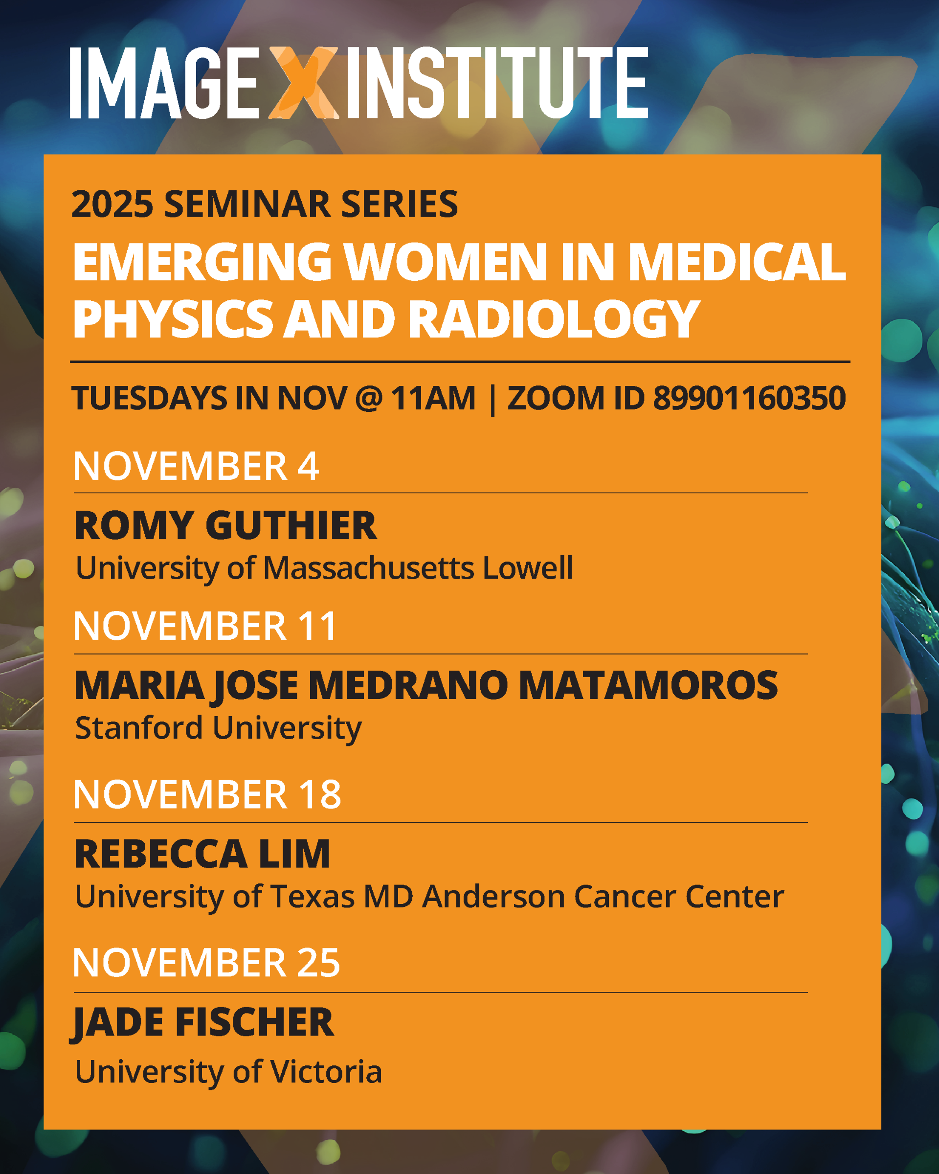 - Nov 25: Jade Fischer, PhD Candidate, University of Victoria, "From Concept to Clinic: Very High Energy Electrons in Radiotherapy"